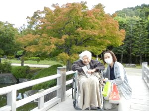 大仙公園内にある日本庭園を散策した際には菊の鉢植えも多数飾られており、利用者様も真剣に見つめておられる方や、笑顔で職員に話される方などおられ、皆様楽しまれておられました😊