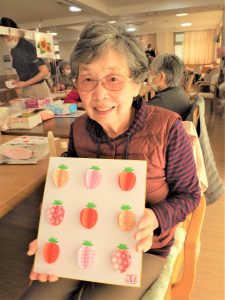 創作レクリエーションでは、「いちごの色紙」を作っていただきました。様々な色・柄のいちごをのりで貼る作業です。集中し、楽しみながらかわいい色紙が出来上がりました。