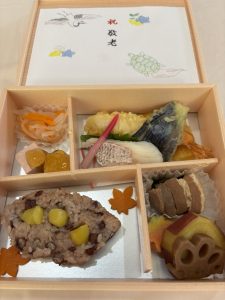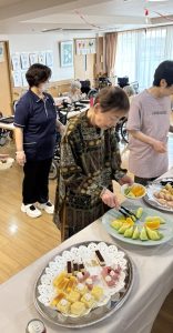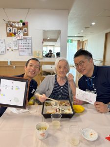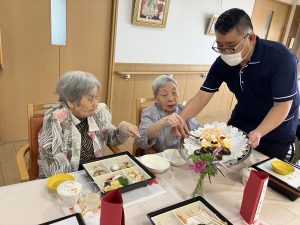 第二部は、久々のご家族との食事会です。調理師が、真心こめて手作りしたご長寿お祝膳やデザートバイキングをご準備しました。「この角煮柔らかい!」「いつもより沢山食べてしまうわ…」等喜びの声が飛び交ってました。角煮や鯛・蓮根は、酵素につけてから調理する特別な「やわらか食」をご準備しました。