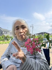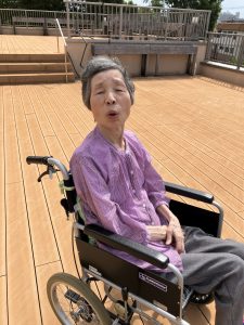 青空の日に施設のテラスに行き「暑いけど風が気持ちいいね。」「花や草が元気ないから水あげよか。」と笑顔で話されていました。また外気中、空や花を見て自然と歌を口ずさむ方もいらっしゃいました🌻