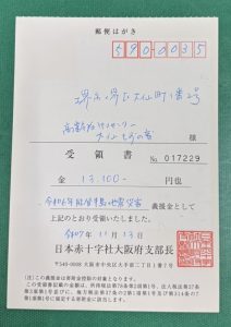 最後にはなりましたが、今回のお祭りにはたくさんのボランティアさんにご協力いただいております。また様々な業者様より協賛をいただきました。衷心から感謝申し上げます。今回の、物販売上金13,100円は日本赤十字社を通じて、令和6年能登半島地震災害義援金として寄付させていただきましたことをここにご報告致します。