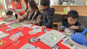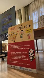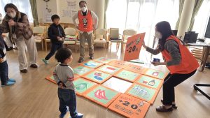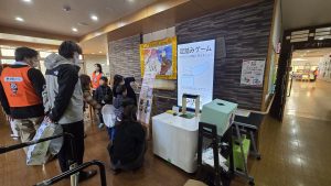 損保ジャパンの方々によるコーディネートのもと様々なコンテンツを体験していただき、楽しみながら防災知識を皆さんで学びました。SOMPOで学防ッチャ~まなぼっちゃ~は、災害時の避難生活に必要なアイテムが書かれたパネルの中から、正しい防災グッズを見分けてお手玉ボールを投げ入れ、チームごとに正解不正解によるポイントを競うゲームです。