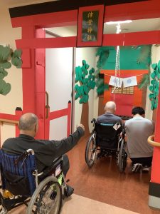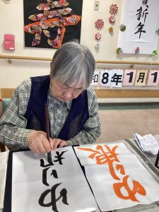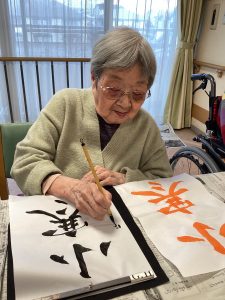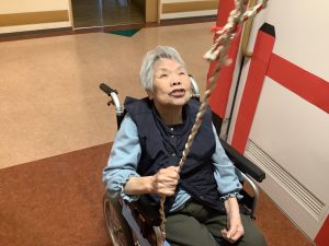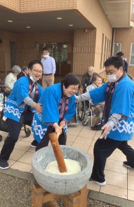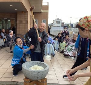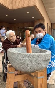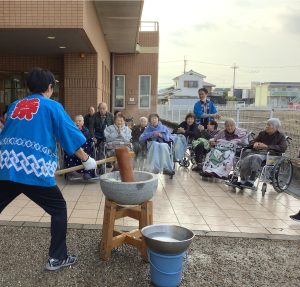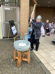 今年は108歳を迎えるご利用者も皆様、力いっぱい杵で餅をつき楽しまれました。