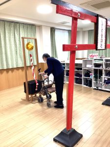 もずの音神社に初詣。寒波の到来により急遽デイフロアに大きな鳥居⛩が出現。「笑って過ごしてたいな!」「元気でここに来れますように」とうれしいお願いをしてくださいました((*´∀`*))