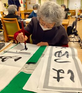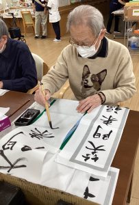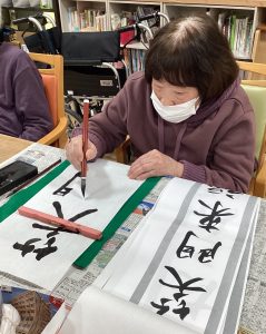 新年といえば書初め!真剣に筆をとられます。「昔は家で書初めしてたけど、最近は中々やる機会がなかったわ!」「久々にうまいこと書けるかな⁉」と言いつつ。立派な作品が完成しました(●´ー`●)